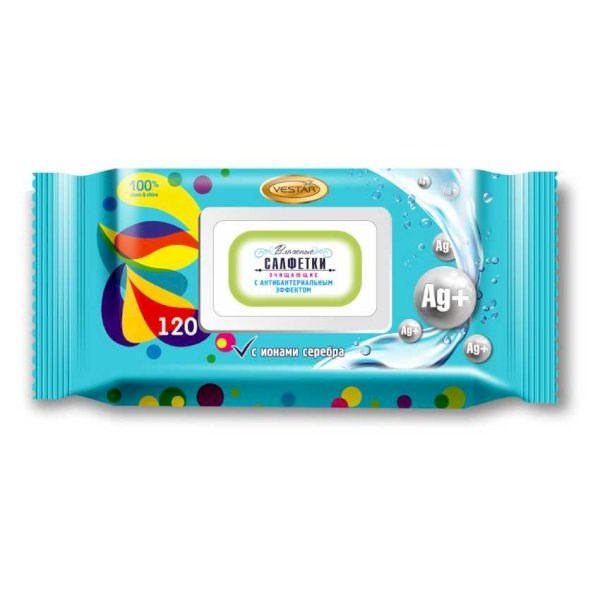 VESTAR Влажные салфетки Очищающие с антибактериальным эффектом, 120 шт, с пластиковым клапаном