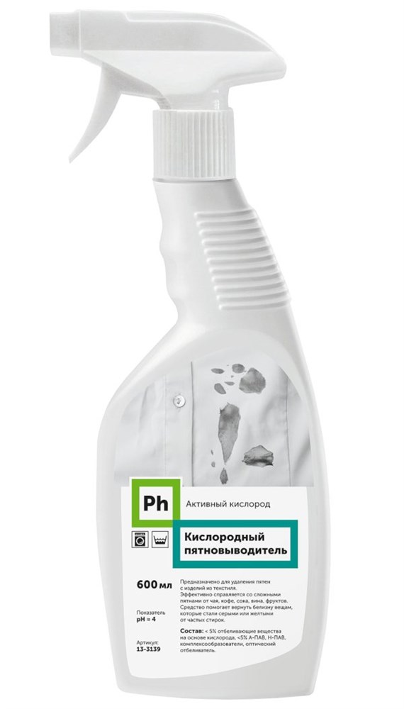 Ph Кислородный пятновыводитель. Пятновыводитель на основе активного кислорода предназначен для удаления пигментных пятен от соков, фруктов, чая, кофе, вина и т.п. Возвращает белизну посеревшим или пожелтевшим тканям. Освежает белье, избавляя от неприятных запахов. Обладает дезинфицирующими свойствам. Применяется для предварительной обработки пятен и в процессе основной стирки.